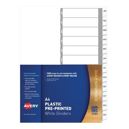 Avery Preprinted Dividers are the quick and easy way to organise your documents. The strong, durable white plastic dividers with preprinted Jan-Dec index tabs are ideal for documents which are regularly accessed and for dividing by months of the year. Together with the customisable table of contents sheet, an organised file can be created in no time at all.Use our FREE software, Avery Design & Print online to create a personalised contents sheet to match your tabs. There are pre-designed templates included to make indexing easier for you, simply add your text and print out using your laser or inkjet printer.
