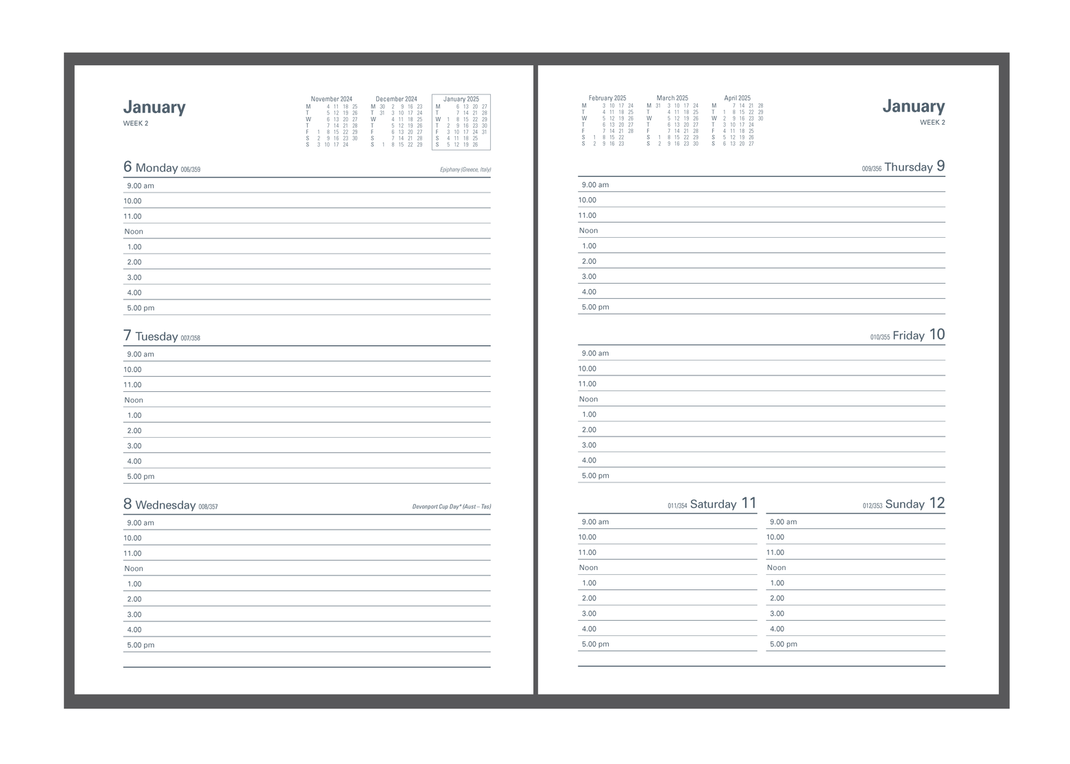 Bound in a practical, hardwearing black linen cover, the Kingsgrove is printed on white paper. Features of this diary include the unique ;calendar notes; page, which lists multi-denominational religious festivals and days of note for the current year, past two years and future four years. 381.P99-24 - A5 Week to View 1hr 9-5pm; 16 pages of useful information, including: * Three-year calendars * Calendar notes * Current and forward year planners * Australian and New Zealand public holidays and school terms * International holidays * Staff leave planner * Addresses * Breeding tables