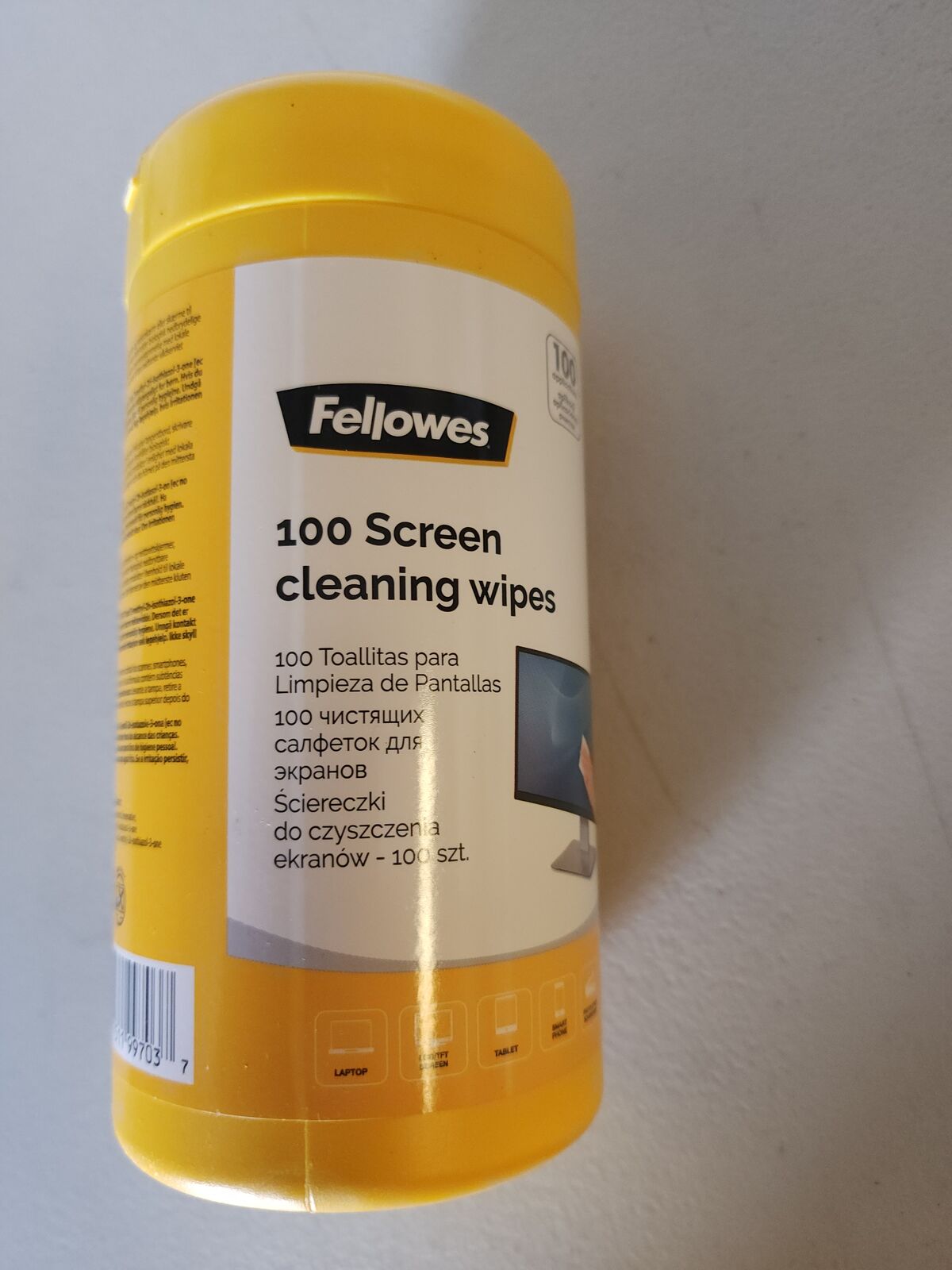Screen Cleaning Wipes Non Streak Tub 100 biodegradable Fellowes 99703