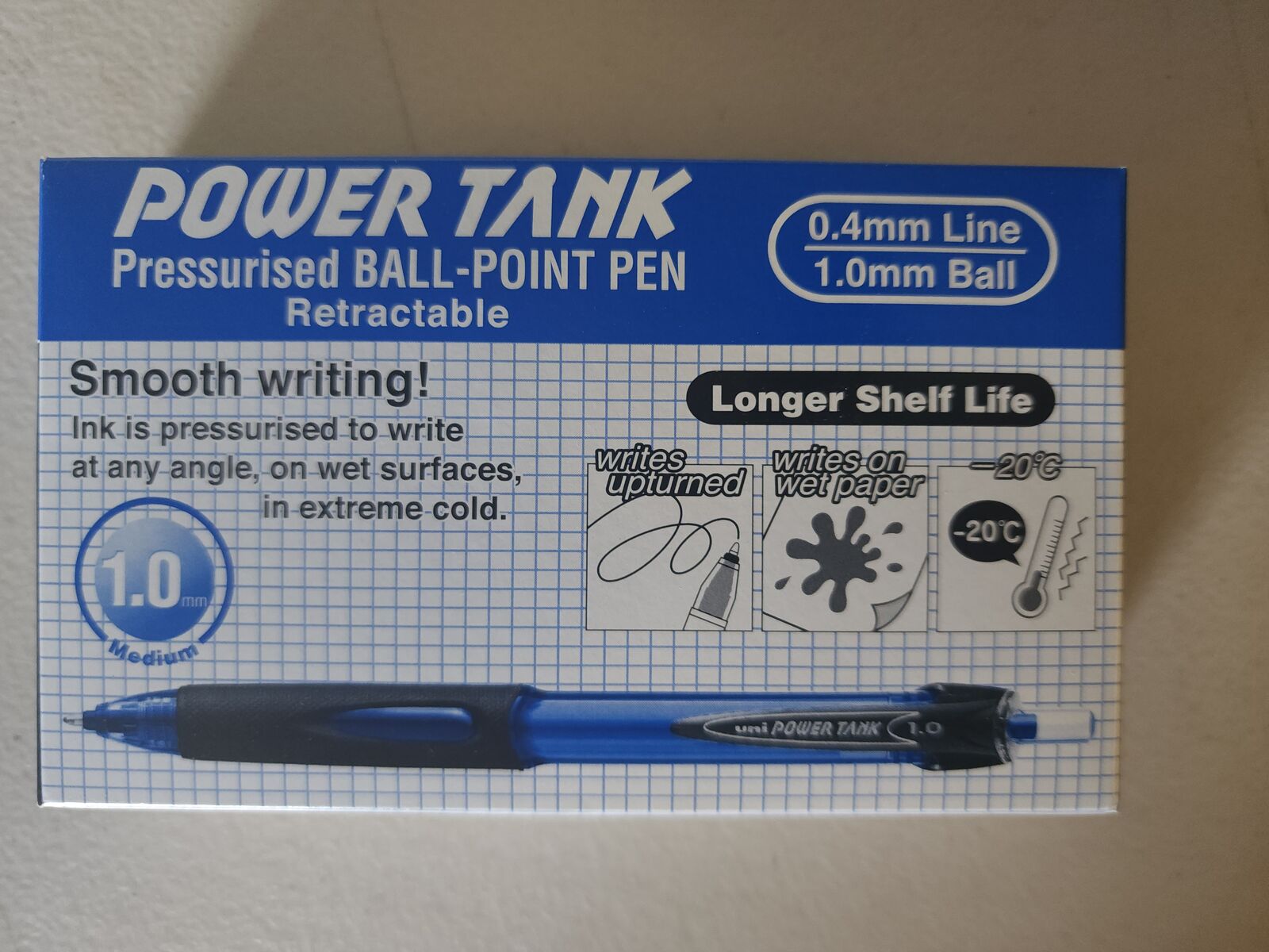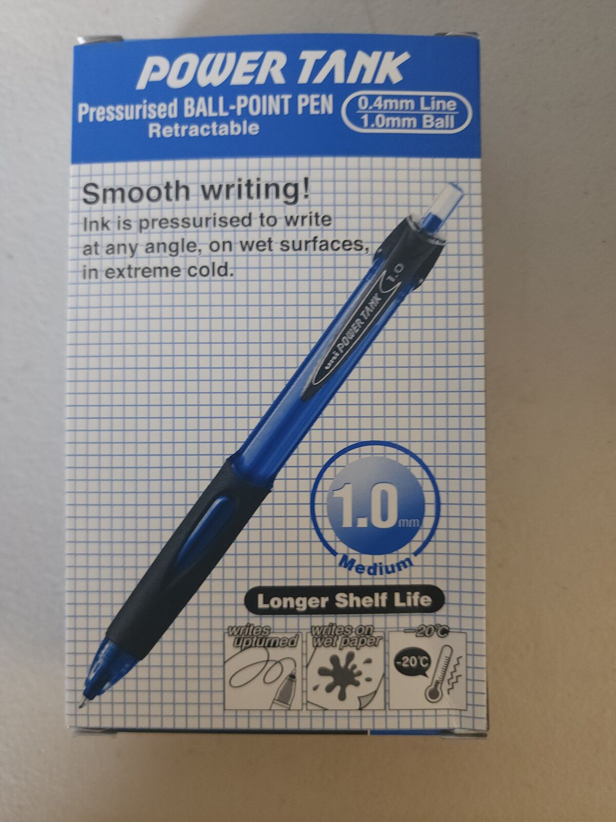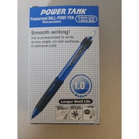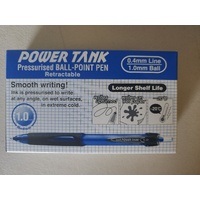 10501228 Pen Uniball Power Tank Ballpoint 1.0mm Retractable SN220 Blue - box 12 A pressurised ink delivery system enables the PowerTank pens to continue writing upside down, in extreme cold (up to minus 20 degrees), on shiny surfaces, wet paper and even underwater. TIP Stainless Steel BALL 1.0mm dia. tungsten carbide ball BARREL PC& Elastic rubber grip (as per ink colour) INK Dyestuff and pigment ink INK REFILL SNP-10 INK COLOUR 3 Colours