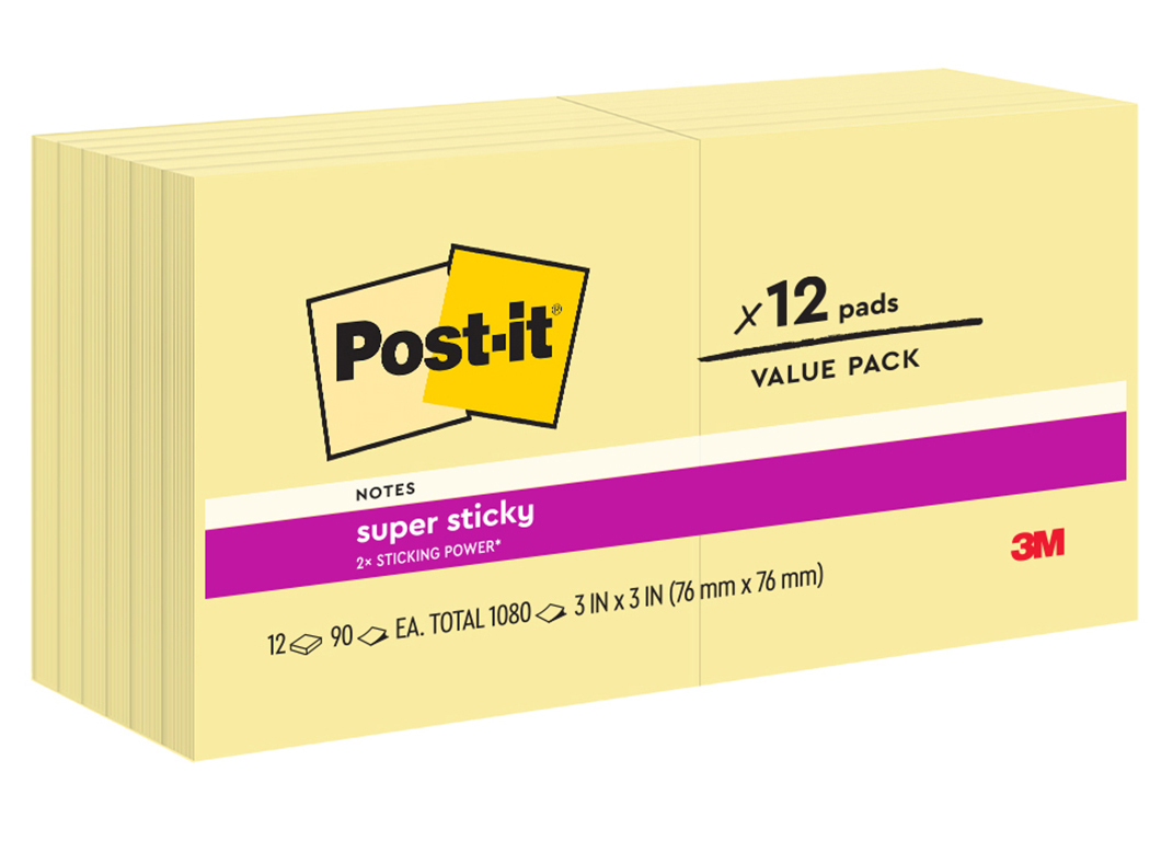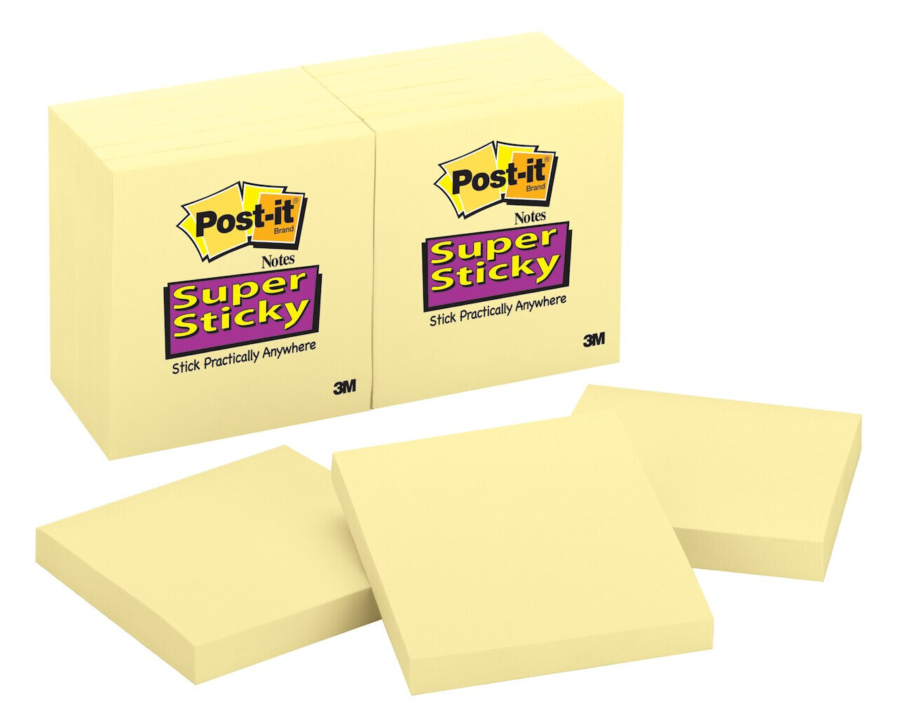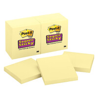 Post-it® Super Sticky Notes in 76mm x 76mm size stick to almost any surface and won't fall off. Ideal for a quick reminder or short to-do list. Canary Yellow is familiar and attention-getting. 12 Pads/Pack.