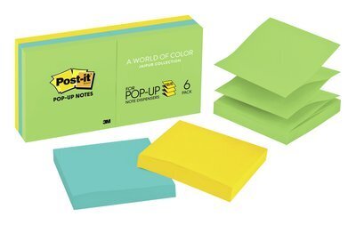 Post-it® Pop-up Notes in 76mm x 76mm size make it simple to grab one note at a time. The size makes life easier with these handy notes. A World of Colour Jaipur Collection emotes colours that draw upon the food, art and culture of India. These accordion-style notes pop up one after another from a Post-it® Note Dispenser.