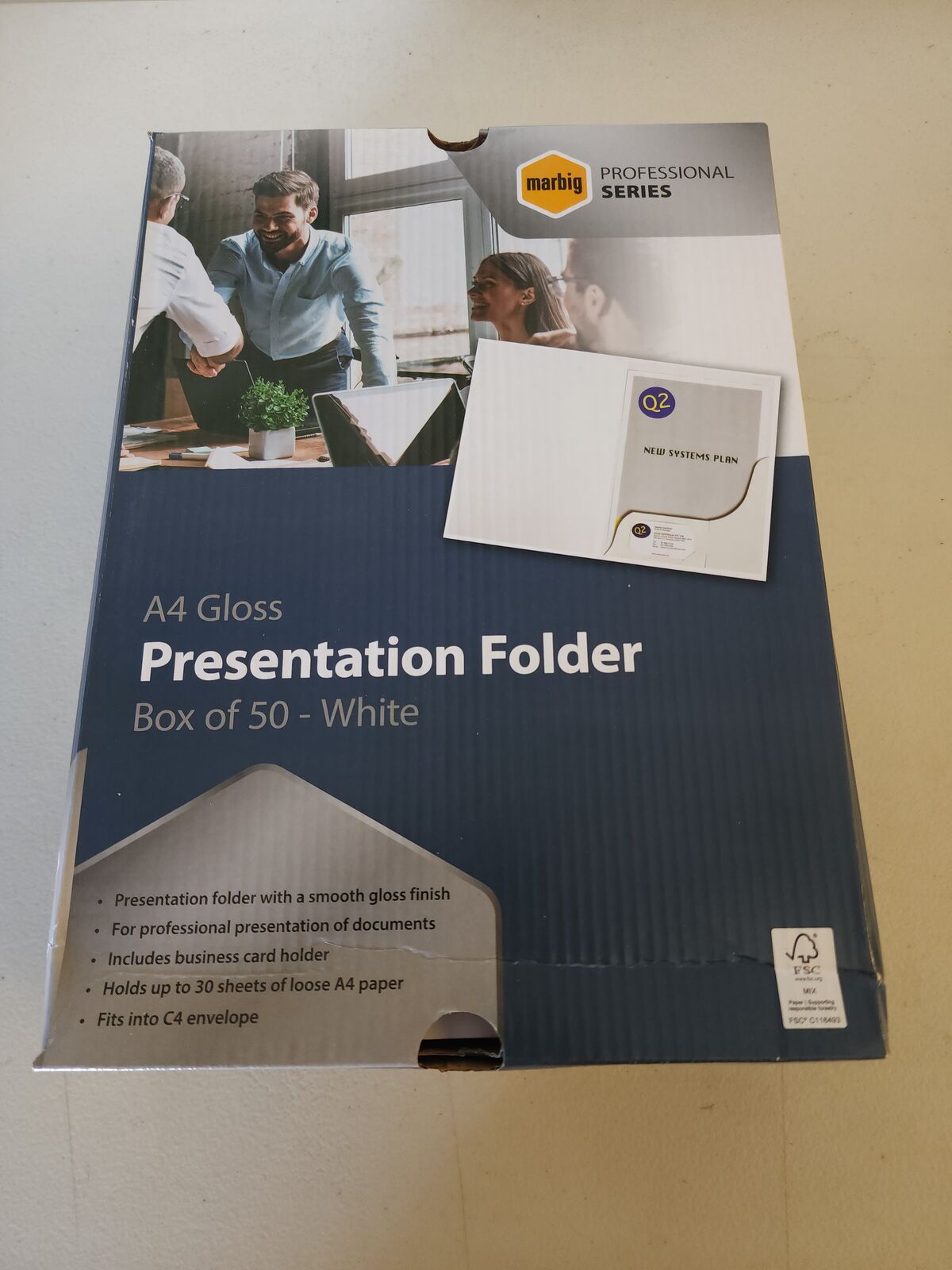 The marbig presentation folders are perfect for professional presentations, letters, profiles, etc. Available in a black or white with multiple finishes.