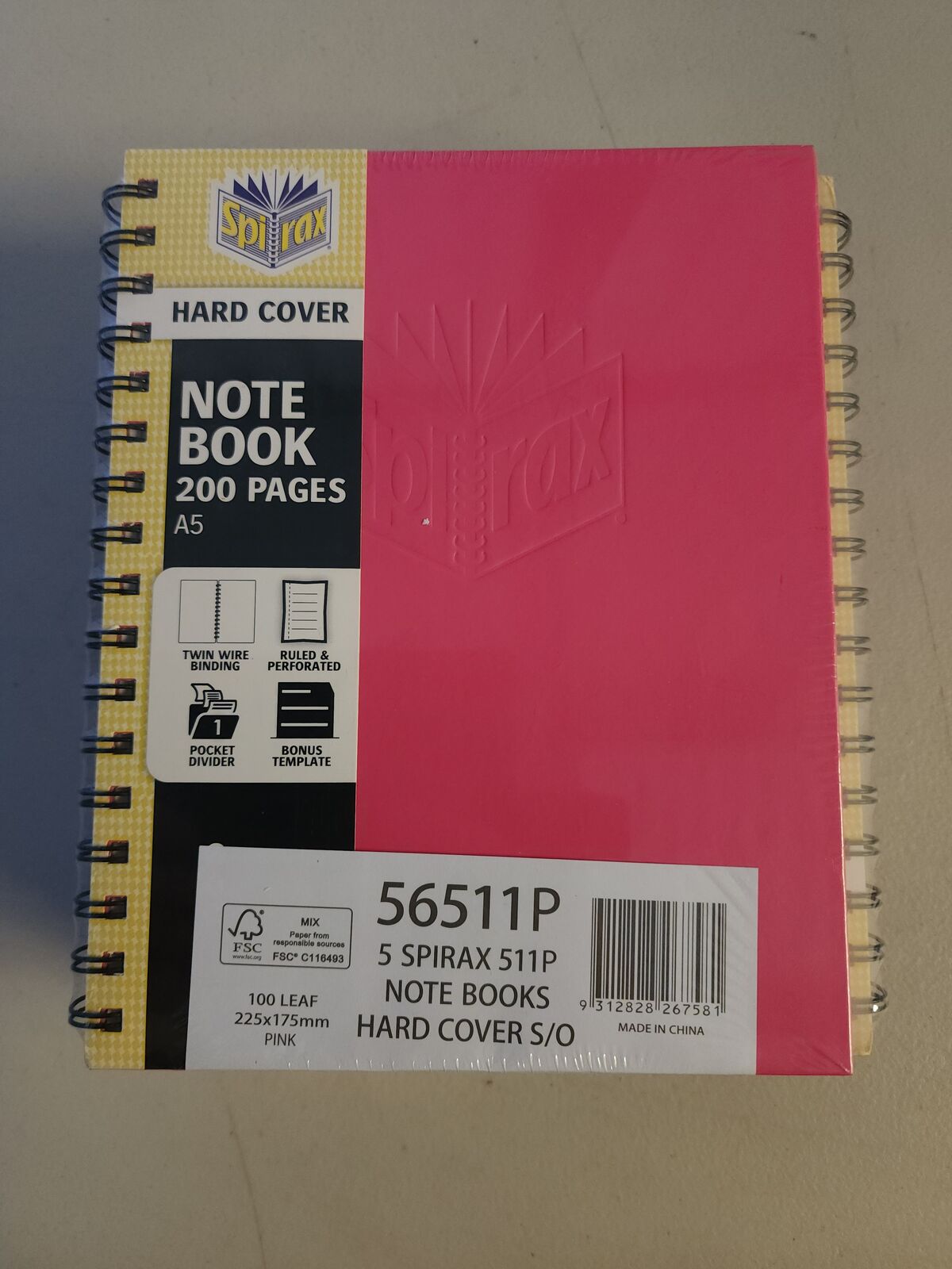 The Spirax 56511P is an A5-sized (225x175mm 200-page (100-leaf) hard cover notebook in pink, featuring sturdy twin-wire binding, 7mm ruled lines with a red margin, and a bonus 4-year planner. Ideal for durable, long-term note-taking, it is often sold individually or in packs, providing a reliable, rigid writing surface