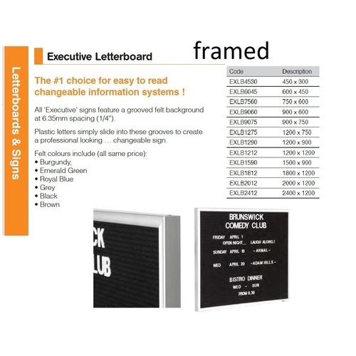 All ‘Executive’ signs feature a grooved felt background at 6.35mm spacing (1/4”).