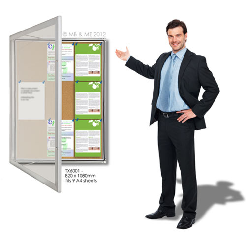 For the 3 largest size cases, 2 lock & keys are fitted Natural cork - pinnable - background is supplied Or a whiteboard background can also be supplied as an option Inform Communicate Educate Create Our range of TX Weather Resistant Notice cases .. the perfect way to visually communicate important printed information. Your messages and notices are too important not be seen. . They need to be presented effectively, clearly & securely .. either indoors or out! Stylish attention to manufacturing detail Internal rubber 'gasket' seals the door Provides outstanding protection in all elements Metal safety stays prevents door being accidentally shut in external windy conditions