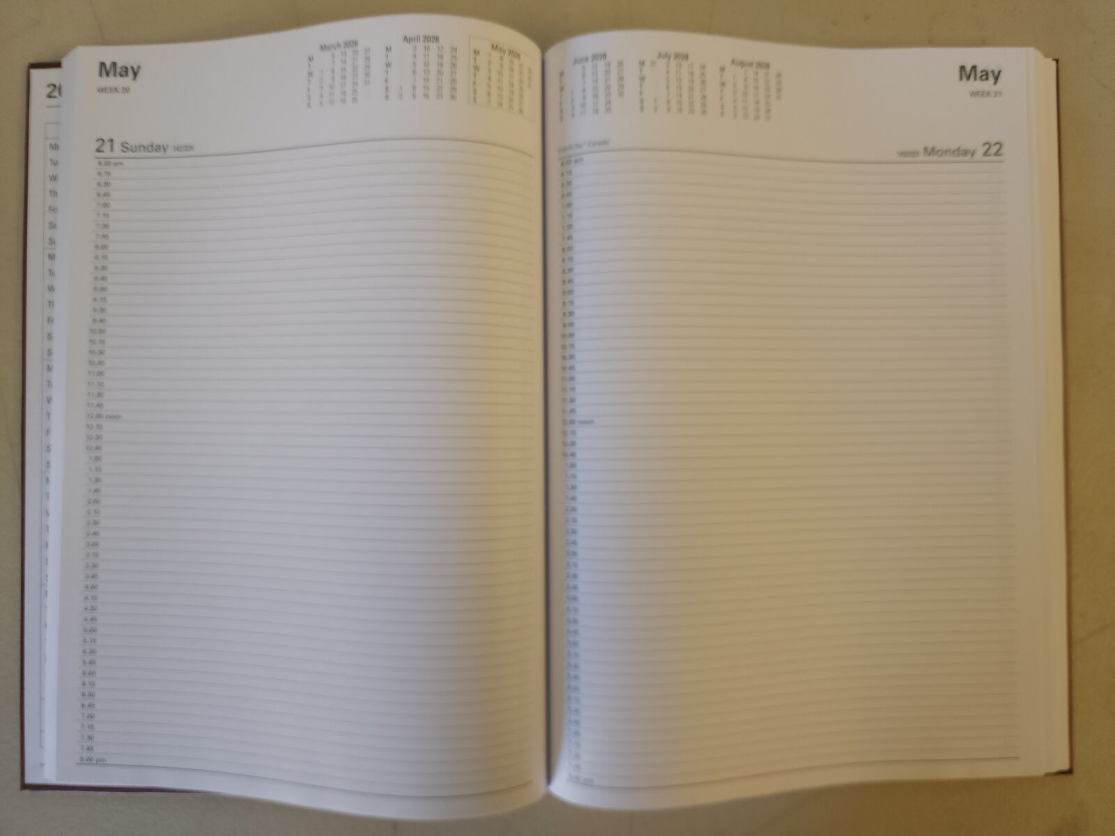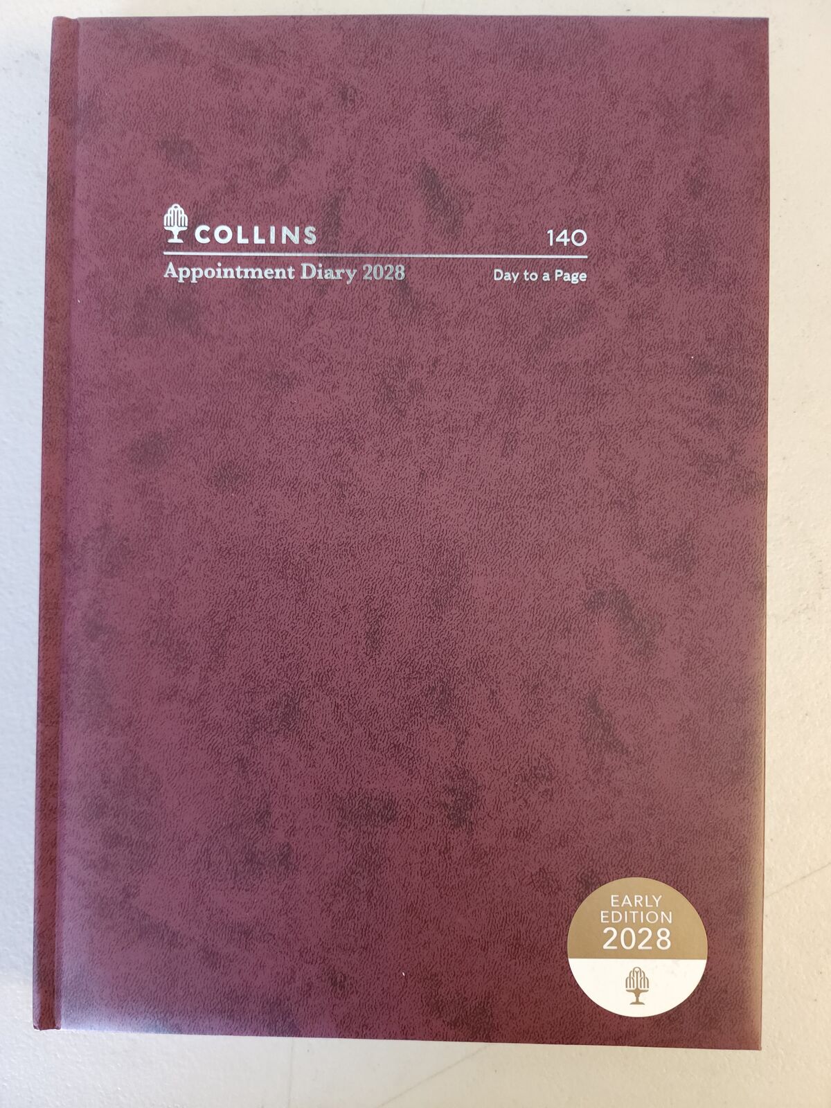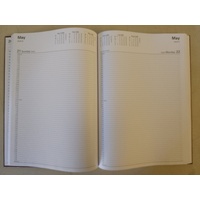 BOUND IN A NEW SOFT LOOK BURGUNDY COVER, SECTION SEWN FOR EXTRA STRENGTH AND WITH TIMES PRINTED CLEARLY DOWN EACH PAGE, THE PAGE LAYOUTS INCLUDE SIX-MONTH CALENDARS, WEEK COUNTS, JULIAN DAY COUNTS AND NATIONAL AND INTERNATIONAL HOLIDAYS ON THE DAYS THEY OCCUR.